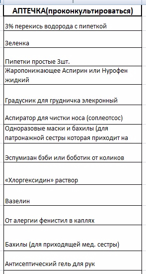 ВАЖНО. Из аптечки уберите АСПИРИН, его до 18 лет НЕЛЬЗЯ. При некоторых вирусных заболеваниях дает очень тяжелые побочные реакции вплоть до летальных. Детям только Парацетамол или Ибупрофен. Рекомендуют что-то в свечах (например, парацетамол), а что-то в сиропе (например, ибупрофен - Нурофен), чтобы в аптечке имелись обе формы. Из семитиконов у нас лучше всего пошел саб-симплекс, а эспумизан с боботиком как-то не пошли. Перекись с зеленкой не покупала, за пупочком ухаживала методом "сухое ведение пуповинного остатка", который рекомендовали в роддоме и который рекомендуют в большинстве стран.