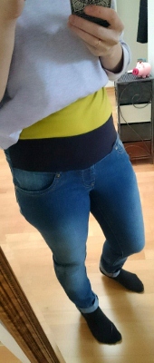 у меня первая беременность, и пресс нормальный, поэтому живота пока не видно, верхняя часть как и была, нижняя если газы, то надувается)), но все джинсы застегиваются, хотя я уже чуствую от этого дискомфорт. Дома хожу в спортивных штанах или леггинсах. На улице леггинсы и платье. И буквально перед новым годом пришли джинсы. Ооооочень комфортно в них. Ззади обычные, спереди мягкий пояс.