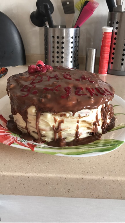 . Ммм. Вкусно. Крем делала из маскарпоне со сгущёнкой. Дочь узнав что в составе сыр отказалась есть данный торт))) но мы с мужем за пару дней его умяли.