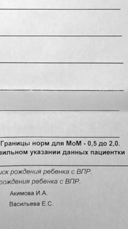Посмотрите ее результат мом, Они 0.5-0.6, Это низкая граница мом, Он д.б от 0.5-2. В идеале 1. Это не значит ниаких пороков), но два маркера трисомии 18 например.