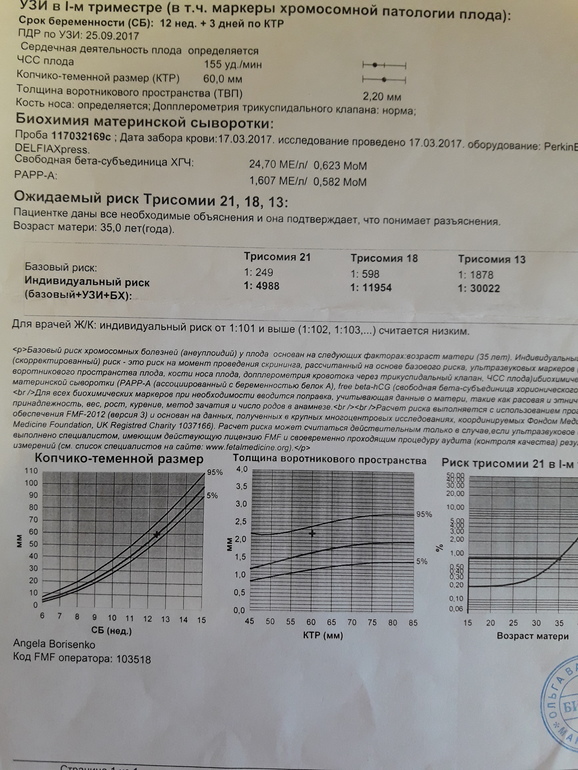 простите, а где вы видите риски?...вот смотрю и не вижу. даже залезла в нормы -и паппа и хгч в пределах нормы...твп тоже в пределах допустимых границ. индивидуальные риски оооч низкие. или где-то еще информация на бланке?