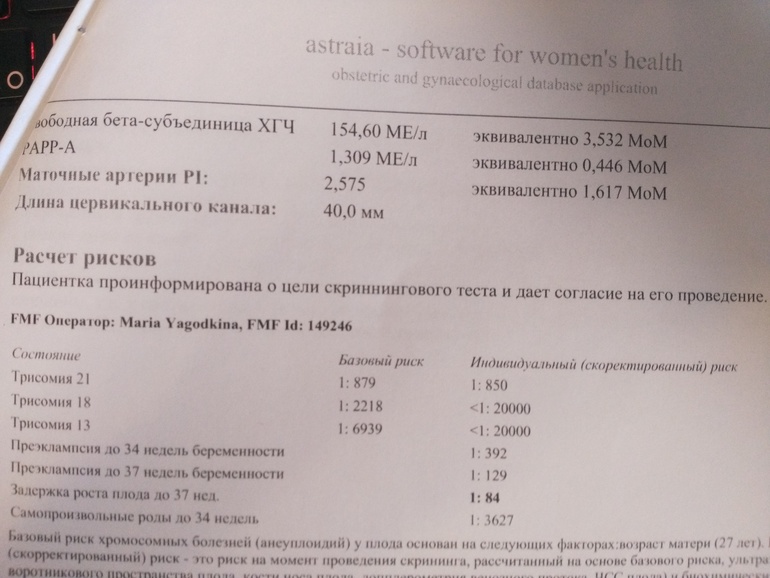 Страхи, переживания и немножечко нытьяСамое подходящее название для поста....мне правда страшно. Все было отлично, никаких отклонений. И вдруг... первый скрининг-на тебе. По двум показателям крови риск аномалии...через неделю после скрина-повторное узи в ЦПСИР... врач молчит...если молчит-значит, все ок? Разговор..."что с ней делаем? Вилка хорошая"..."отправляем к генетику". Генетик не принял, сказали, что посмотрел результат-не критично, подождешь. Иду обратно ко врачу. Говорит "завтра приезжай с утра к нам-отведем без записи к хорошемв генетику. По узи все ок, в остальном все она тебе расскажет".... осталось дождаться завтра....хгч выше нормы на 1.5 раза, а рарр-а не хватает до нормы 0.2 значения.....
