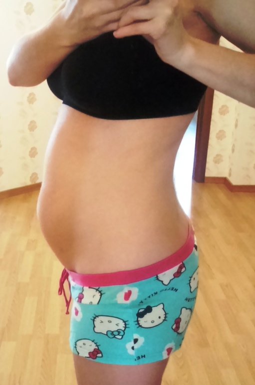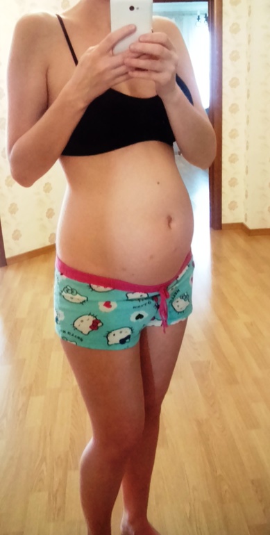 И вот полубоком,так вооообще видно какая я вся из себя беременная!На животе видны следы от от прошлых лапар,а уж пупок из себя представляет жалкое зрелище,но это все фигня по сравнению с тем,что мы наконец-то совсем скоро станем мамой и папой))
