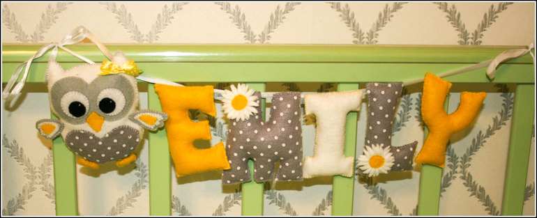 Фетровая гирлянда с именем сшита собственноручно под впечатлением от самодельных фетровых мобилей. Жаль, что при изготовлении не учитывается их смысл и желание ребенка. Вместо красивых животных, облаков и звездочек он видит звериные попы и тонкие полоски чего-то невнятного. Ни разу не встречала мобиль, где игрушки смотрели бы на малыша вниз. Я же не могу спать спокойно, если не слеплю что-нибудь для ребенка. Результатом довольна, все элементы съемные в дальнейшем, например сова, будут игрушками.