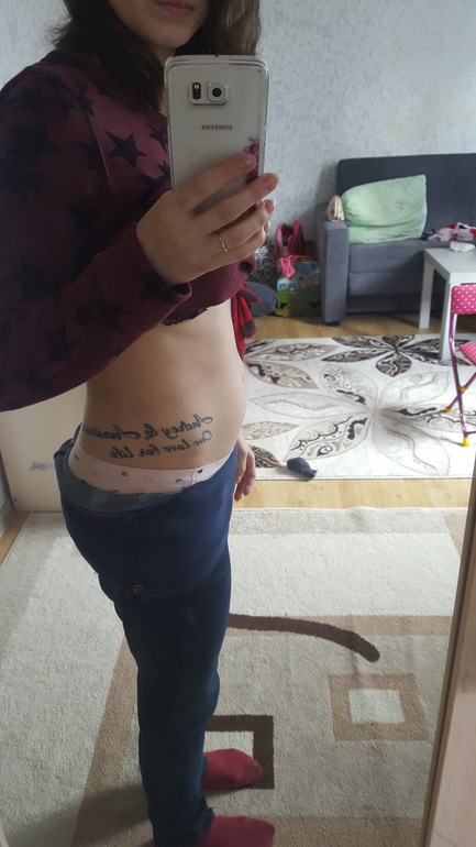 На работе молчу,хожу в свободных платьях. Мечтаю об обтягивающих вещах.Насала раньше вечером ложиться спать. И да,стали поджимать добеременные джинсы в районе животика.