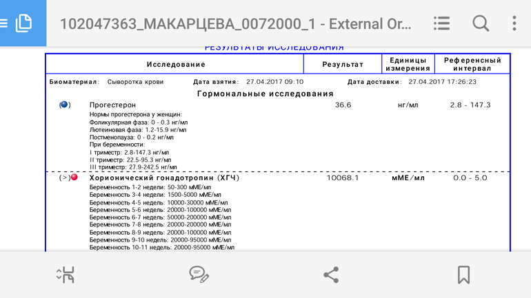Нет, Слава Богу. Надо завтра врачу позвонить 😕 Запереживала. Она вообще мне не говорила здать его. Я сама для себя здала. В первую Б на Дюфастоне с гематомой и выделениями был 34. Видимо моя норма такая