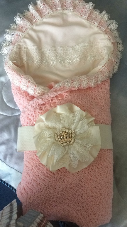 Плед замечательный! И с бантом по цвету очень сочетается. К этому ещё кружевную пеленку с уголком и костюмчик девчачий под бант и будет готовый комплект)))