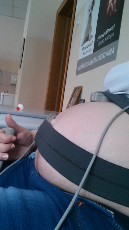 Врач мне - пошли на другой аппарат!Сажусь,опять сначала слева ищет - нету ничего на экране!Потом справа - слава Тебе,Господи,сб нашлось!!!Врач уходит,я сижу.Смотрю на монитор и кнопочку нажимаю когда шевелится малышка.Матка сегодня, как никогда раньше,приходила в тонус всё КТГ...Вроде все в норме,паника отошла немного!Сфоткалась на память,вот это мы)))