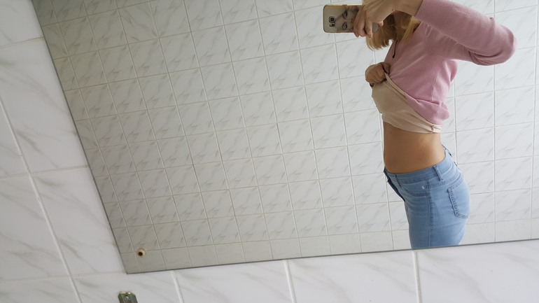А так- появился только в 16-17 нед, тогда я перелезла в беременные джинсы. Кроме них, до сих пор вся одежда добеременная. Но я изначально комплекцией покрепче.