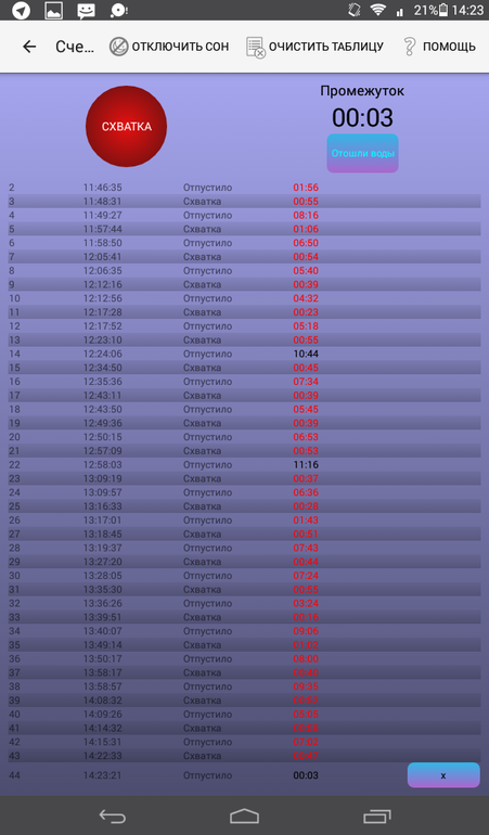 ПредвестникиВот смешно аж самой,5й раз в роды идти,а я никак не могу понять,что со мной происходит. С ночи живот прихватывает ,как при месячных и напрягается,каменеет, на 30-50 секунд через промежутки примерно одинаковые, то больше то меньше. Все время,пока лежу,чувствую сХватки эти, больней вроде не становится вот думаю,это ложные или настоящие схватки? С ночи непрерывно идут. ребенок шевелится. Больше никаких предвестников. Пузырь мне всегда на столе вскрывали при полном открытии, сам не лопался. Пробку только с второй видела. Вот не знаю,что делать. Ношпу 2 шт выпила,все также...ехать раньше времени в роддом тоже не хочу,наковыряют еще,если не в родах,то зарожаю можно б еще недельку походить...вот скрин схваткосчиталки-ваше мнение?