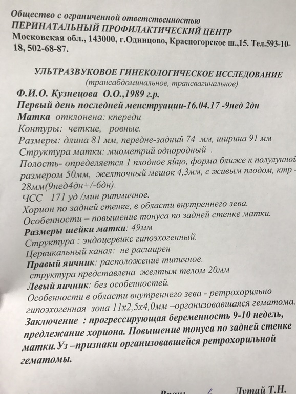 УЗИ, КТГ, доплерС малышом все хорошо, в остальном организовавшаяся ретрохориальная гематома и предлежание хориона