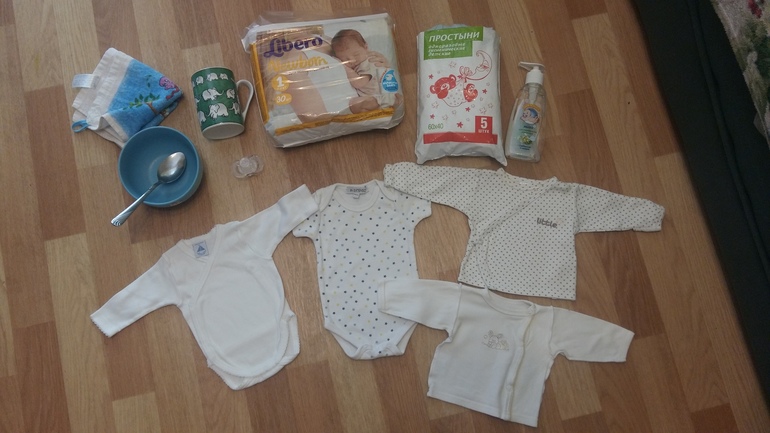 -боди с длинным рукавом,с коротким и две распашонки (вдруг захочу нарядить,а вообще,там выдают пеленки,в прошлый раз сына пеленала)