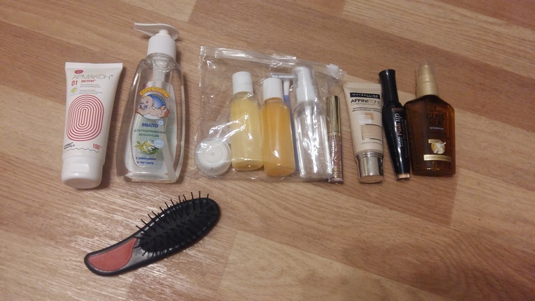 -гигиеническое то се: шампунь,бальзам и все такое в мини бутылочках из фикс прайс; тушь,блеск,тональный-для выписки; крем мой обычный наверное выложу,в мини бутылочках уже там надавила,думаю,хватит; расческа,масло для волос,резинка для волос