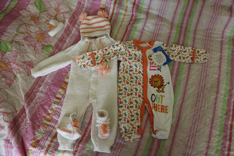 Верхняя одежда: комбез, который одевается перед выходом на улицу, после фото, торжественных поздравлений и т.п. Конверт с прорезями для ремней автокресла, в котором можно вынести, если душа требует, а потом легким движением руки снять для фото. Там же пристегнуть в автокресло и нести уже на улицу в машину.