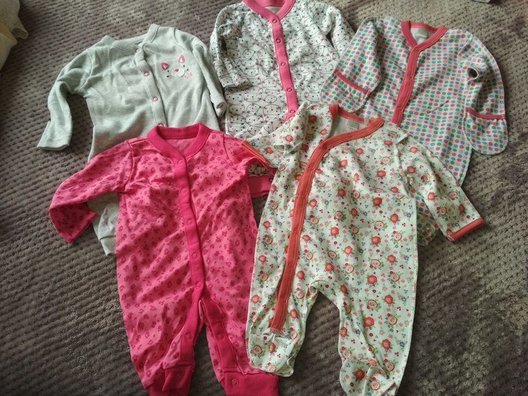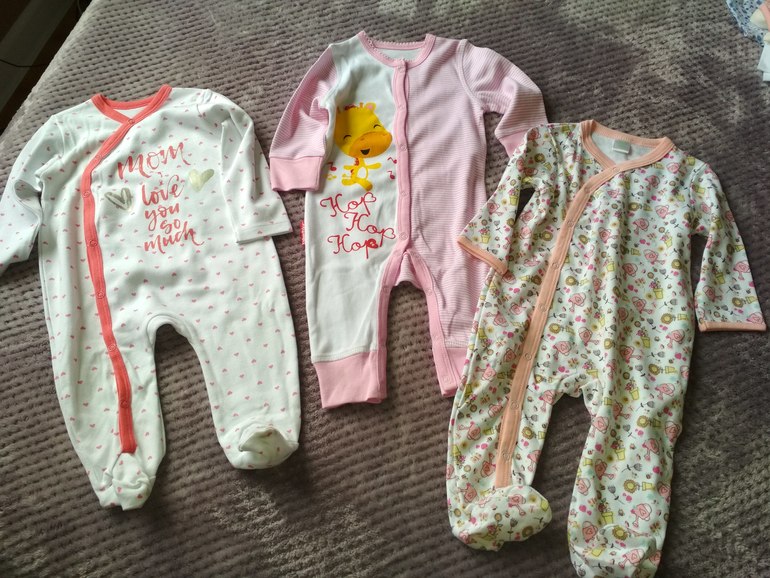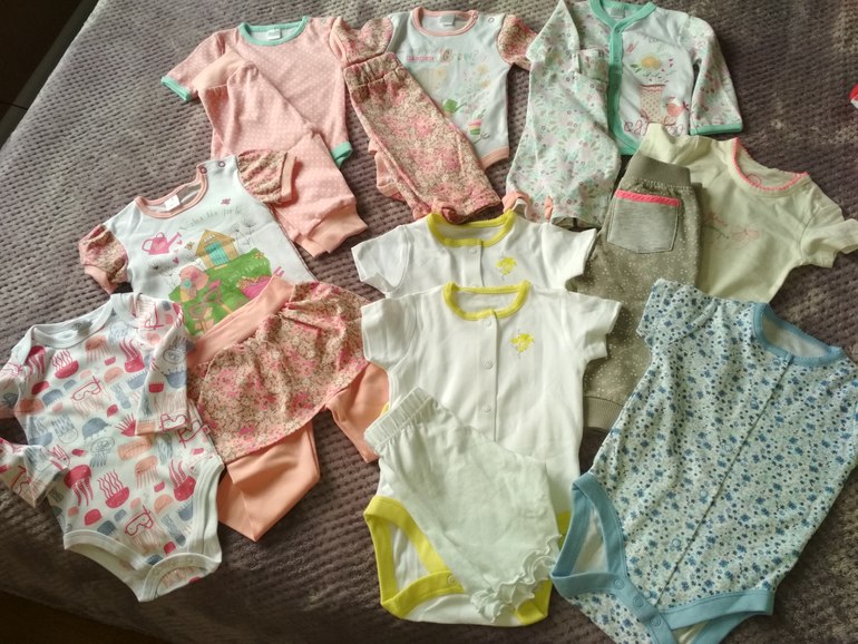 На 74 размер вещей взяли минимум, предположительно будет теплая весна,начало лета. Какой размер реальный будет непонятно и какая погода тоже. Но по распродаже ухватили немного. 3 слипа(подойду для сна), четвертый с коротким рукавом если дома будет жарко, ну и юбочку на улицу, платье можно и как тунику использовать.