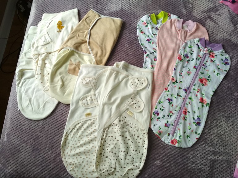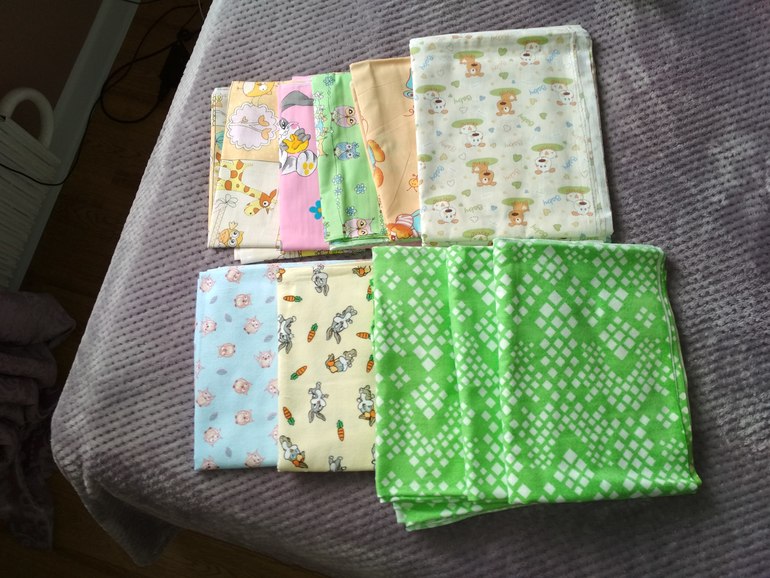 А пеленки-коконы покупали уже по закупке и шили. Слева первые три штуки плотные, на случай холодов в квартире.