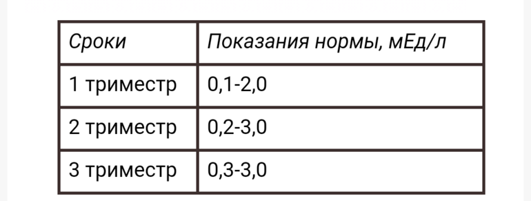 «Нормой ТТГ при беременности условно можно считать 0,4 - 4,0 мЕд/л, так как в различных лабораториях результат анализа может отличаться от вышеуказанного.»