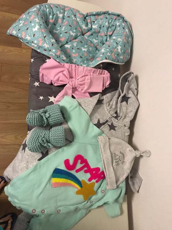 У нас так будет. Мятный слип, носки, мятные пинетки, серый комбез, шапочка и конверт (внутри мята, снаружи серый)