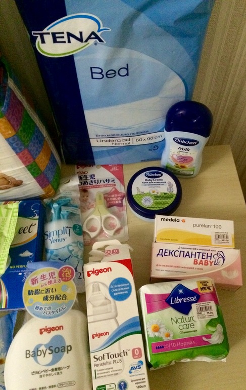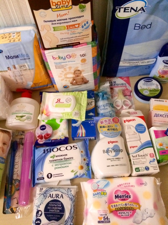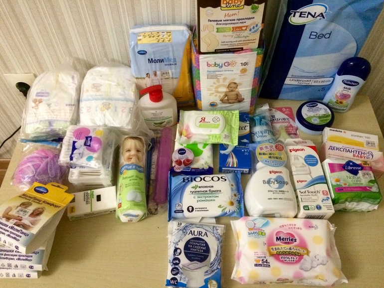И для вас, и для ребёнка одно детское мыло, для вас ещё шампунь и для зубов. Большую пачку влажных салфеток, влажной туалетной бумаги, подгузники, прокладки, пеленки. Пурелан. Все.