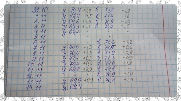 Дата приема 13.11 вес 70.9 прибавка -0,9 кг за 2 недели.