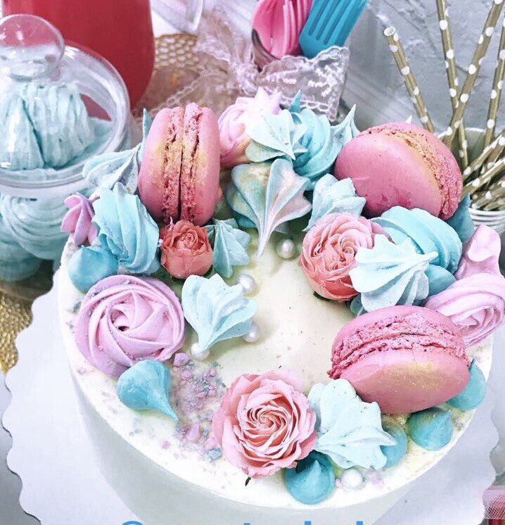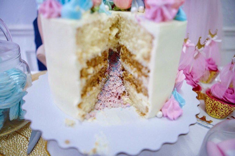 Смысл в том, чтобы узнать пол, разрезав торт, мы выбрали вариант цветного конфети внутри, чтобы крем не портил интригу, оставшись на ноже)