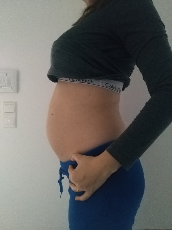 В одежде живот выглядит как-то аккуратнее))) Малышка толкается уже под самыми ребрами. Иногда так "танцует" что телефон из рук выбивает, когда я лежу!