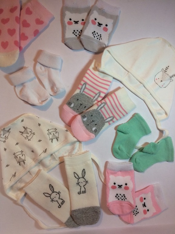 4. Чепчики трикотаж, 2 штуки, 56 размера ( вопрос надо ли меньше, какие - то большие чепцы на вид) , ну и носочки тонкие и теплые. Носочков как- то много получилось.