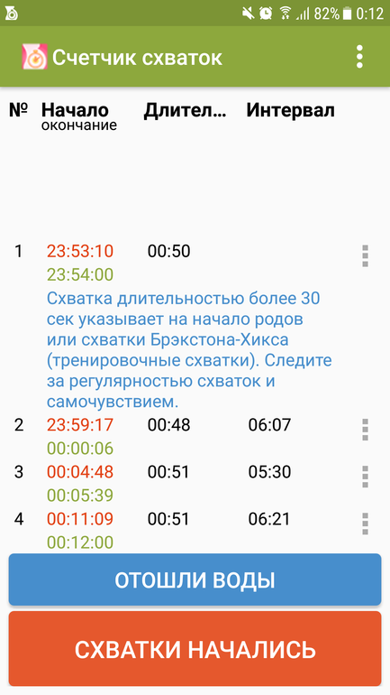 У меня точно такая же схваткосчиталка считала мои схватки! )) и начиналось все так же! Лёгких тебе родов!! Тебе когла приложение напишет о том что интервал меньше 5 минут можно ехать в роддом!)