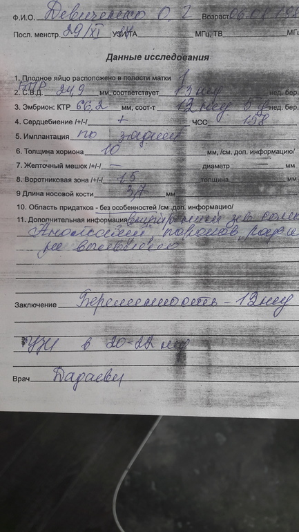 Врач мне не понравился.Первый раз я к ней пришла 21 февраля в 12 недель по месячным.Она сказала,что ребенок на 11 и 2 и для скрининга очень рано.Отправила гулять до 3 марта.В принципе по результатам УЗИ все замечательно,но меня смутило,что органы внутренние не расписаны в УЗИ.Не могла она решить какое прикрепление хориона.Методом тыка -по задней стенке.