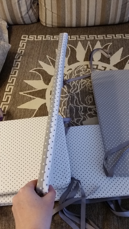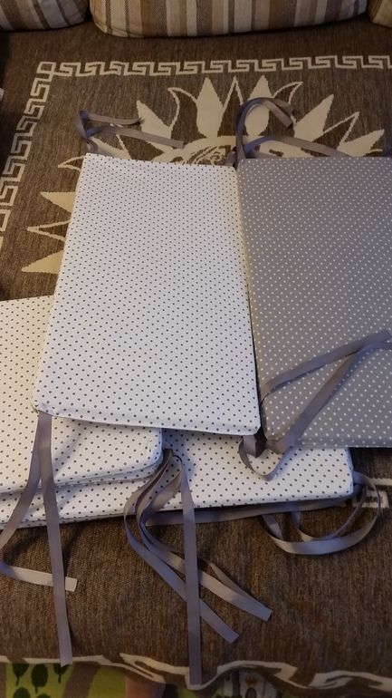 Тоже начала шить бортики сама. Делаю без чехлов, сразу набиваю холлофайбером, в принципе постирать и просушить всегда можно. Единственное вместо ленты делаю петельки, т.к. начиталась, что атласная лента трепится, а тут заменил на новую и все😉