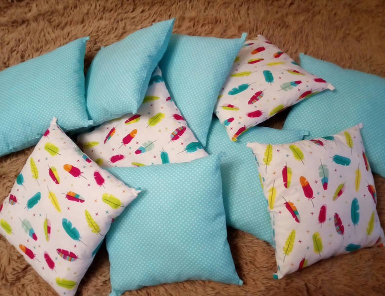 Тоже решила сшить сама, буду использовать синтепон, тот что метражом продается, плотность 300, в два слоя. Долго думала чехлы делать отдельно или сразу в наволочку синтепон закладывать, остановилась на втором варианте. Их так же можно будет стирать, только вручную. Чтобы синтепон не елозил внутри, посередине подушки пуговкой с одной и другой стороны прихвачу.