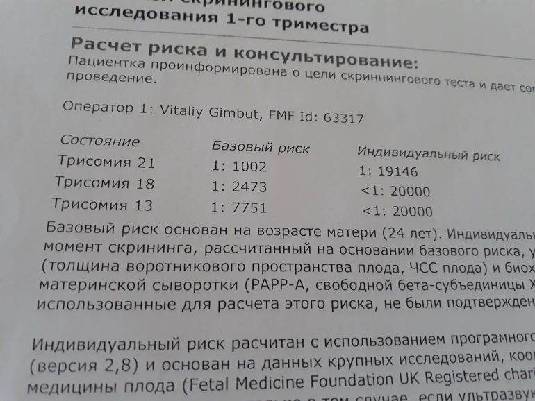 Первое это то что я целый день шлялась по врачам потому что почти в 37 недель не могу определиться у кого рожать. Ну а второе это то что один из них увидел что биохимический скрининг 1 триместра показал завышенные результаты хотя узи в норме и индивидальный риса 1:19146 это не дает мне покоя...потому как первая была прервана именно из за того что ребенку ставили синдром Дауна. Исправьте категорию если не верно