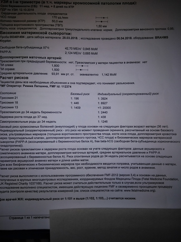 Самое главное в конце... Риск развития болезни Дауна и т.д низкий. Можете не переживать.