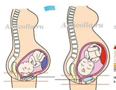 Что ребёнок может лежать как бы облокачиваясь на переднюю часть живота, живот от этого "выпирает", визуально увеличивается.