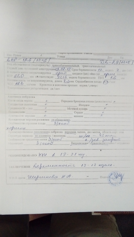Срок по месячным 12 недель и 2 дня, по узи 12 недель и 6 дней. Все параметры в норме, врач сказала, что хороший малыш, правда соня. Пыталась растормошить - не вышло. Включила послушать сердцебиение и разрешила сделать фотографию малявки на телефон. Предположила пол, но закрашивать кружочек пока не буду. Мало ли, это ведь еще не точно.