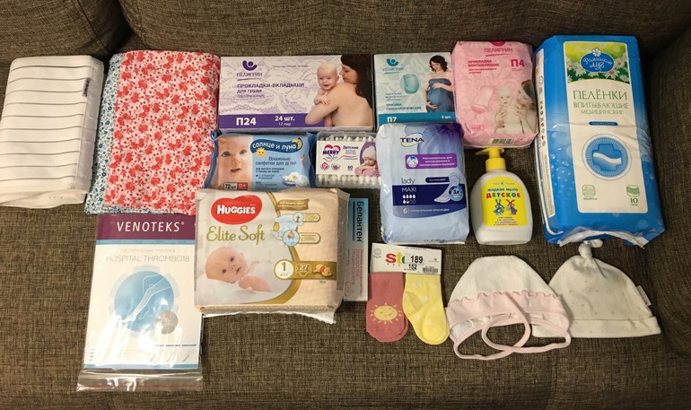 Тут: бандаж на случай КС, две ночнушки самые простенькие купила, чтобы не жалко выкинуть было, за сто с копейками рублей; чулки компрессионные, тоже пусть будут, мама отдала после операции; прокладки для груди; влажные салфетки детские; палочки с ограничителем; хаггис для новорожденных, купила три пачки по купону с 50% скидкой, пачка обошлась в 178 рублей в дочках-сыночках; прокладки послеродовые взяла наобум; трусики одноразовые тоже первые попавшиеся; пелёнки одноразовые; две шапочки для дочки; носочки (ппц цены на них 😱, жалею что на али не заказала, хотя в корзине лежат давно, но уже могут не успеть прибыть); детское мыло жидкое, фиг знает зачем, но у многих оно тоже есть и я взяла 🙈; Бепантен для сосков взяла. Осталось купить халат, бюст для кормления, гигиенические принадлежности для себя, свечи от геморроя 😒, микролакс ещё возьму, все прям нахваливают, наверное после родов нужная вещь. Ну и остальное у меня вроде есть, типа тапки моющиеся, полотенце, посуда 🍴 молокоотсос покупать заранее не буду, по факту посмотрю, нужен ли.