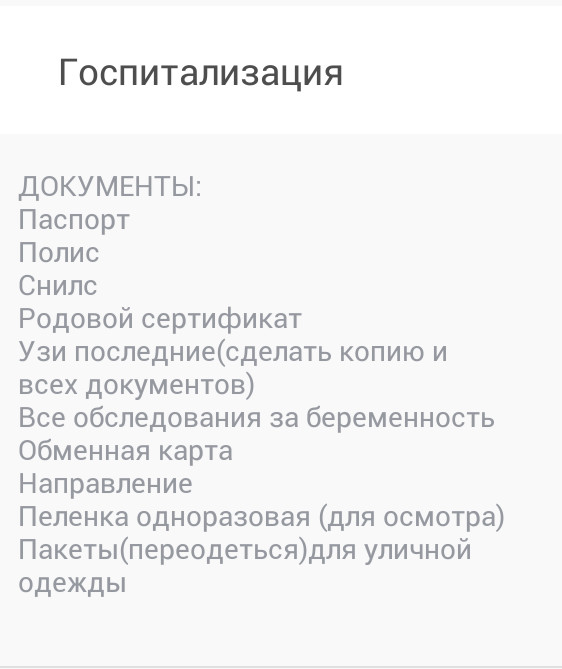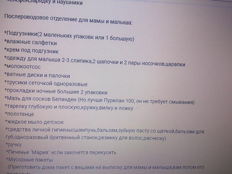 Ну и везде само собой документы все и телефон с зарядкой, дополнительный груз Вам ни к чему, таскать на себе придётся скорее всего. Все многоразовое с дородового не дублирую в других пунктах, все и так понятно, что пригодится. Так же не пишу про одежду для себя и малыша в послеродовом, у нас по 20 штук казенных пелёнок на день выдавали для малыша, а для мамочки только их сорочка (приносили ежедневно чистую) и халат для выхода в коридор. Одежда для малыша мне не пригодилась, т.к. было очень жарко в палате, лежала только в шапке, носках, рукавицах и подгузнике, но иногда я пеленала (правда в свою пеленку, но можно было и не брать с собой, т.к. роддомовских хватало).