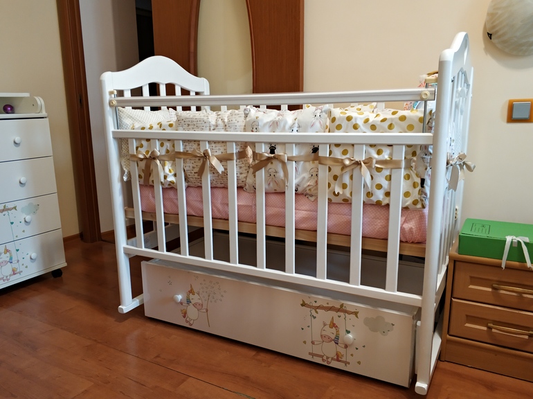 Я с Москвы заказывала. Называется серия by-twinz. Можно ещё комод заказать. Вот сайт by-twinz.ru. Мне по качеству очень нравится, там поперечный маятник, легко качается. Там много разных вариантов. Мне единорожки понравились)