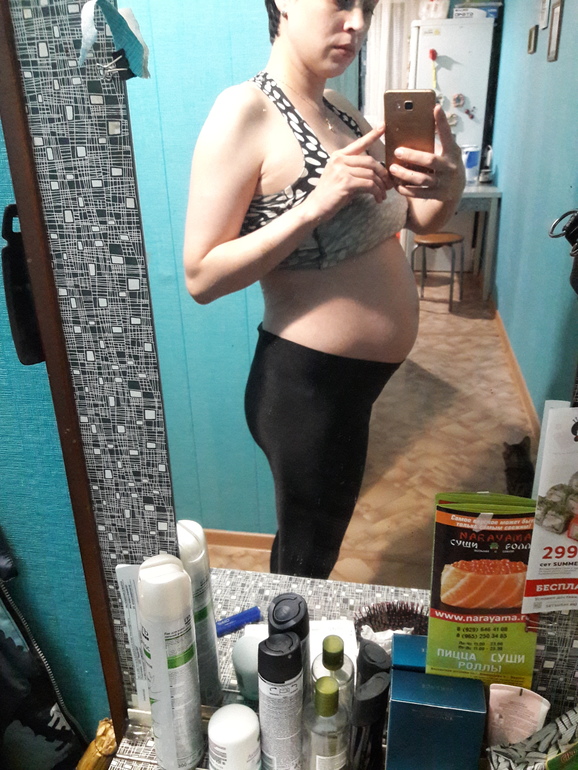 По состоянию-чувствуется что малыш огромен,когда сижу-давит в ребра...при этом у меня маленький животик..в 20 недель только появляться стал...прибавка к 30 неделям 5 кило...