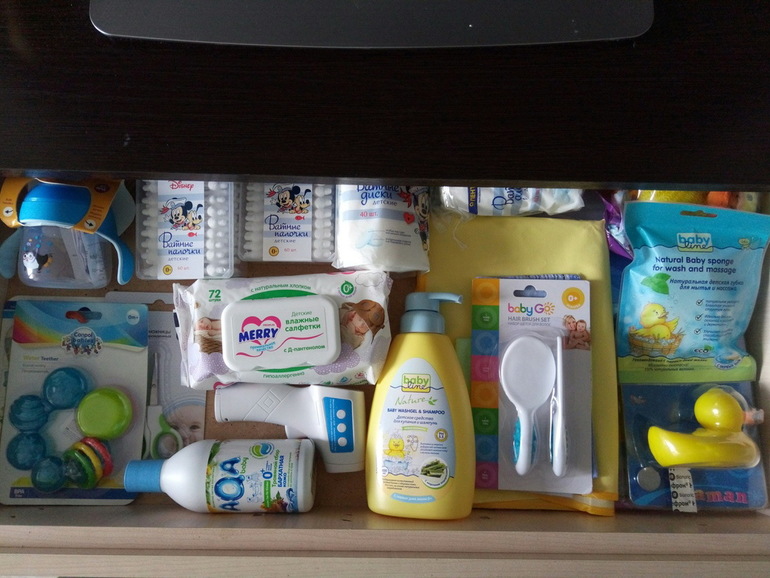Это всякие умывальные штучки, сегодня они переедут в ванную комнату,когда наш папа повесит полочку))) Ещё часть штучек уже в пакетах, готовятся ехать в роддом) Вот все готовятся, только не мой сын!)))