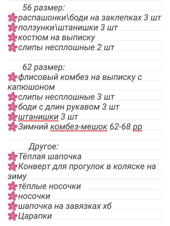 Списки приданогоВот составила примерный список одежки, но некоторые нюансы не понимаю. Вот что удобнее: распашонки или бодики? Или вообще слипов набрать? Просто беременность первая, опыта нет. Кто-то в окружении говорит, что только боди и слипы. А кто-то распашонки и штанишки, что типа подгузники удобнее новорожденному менять или вообще вместо них в пеленку завернули и красота. Вот и не пойму, как на деле))). Дочка ожидается не маленькой, мы с мужем 175-186 см, я сама 56 см родилась и УЗИ показывало длинноногость Малышки))) Не сплошные слипы-это с открытыми ножками, думаю лучше носочки одевать. И ещё есть мысль брать лучше 62 размер-рукава и штанишки можно закатать, так как чую, что с 56ого быстро вырастет. Вот списочек: