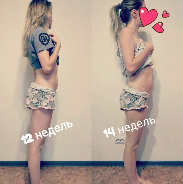 Вот ровно 14 по месячным (по УЗИ немного опережали). Это не вздутие, но пузик скорее подпирает имеющийся жирок)) Я 170 см и 71 кг на этом фото. Беременность первая.
