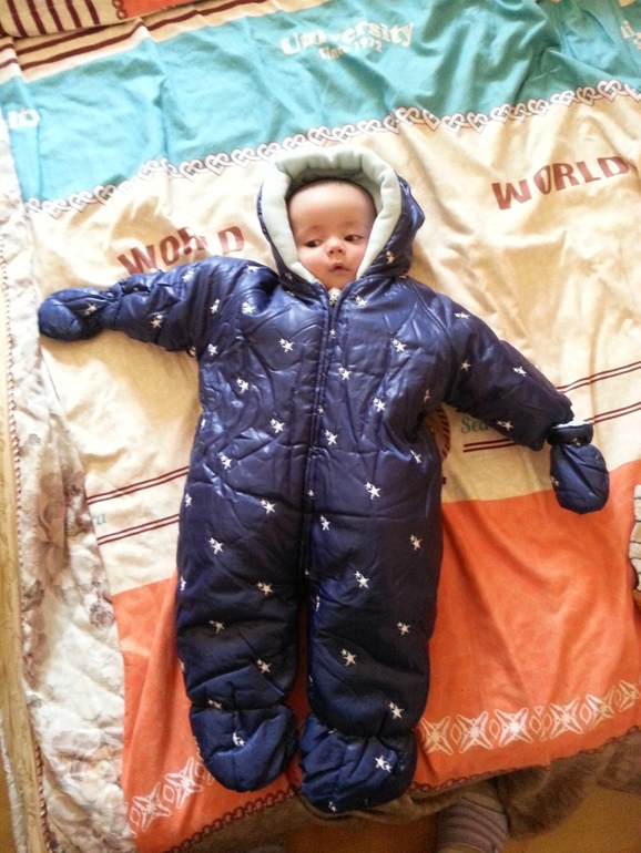 Нам папа купил комбинезон до рождения. Не трансформер. На фото сыну 5 месяцев и его ноги заканчиваются примерно там, где у комбинезона коленки. Это было очень смешно и неудобно. Я честно думала, что мы и часть этой зимы в нем отходим, но к 10ти месяцам малыш перерос комбез, он сейчас 80 см, а комбез где-то 77.