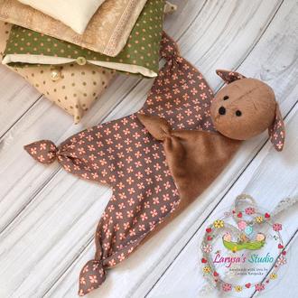 Сшейте штук 5-6 одинаковых (чтобы стирать, мой во время прорезывания зубиков их измусоливал за 20 минут так что они прям мокрые были, меняла после каждого сна). Лучше чистое х/б. Учитывайте, что ребенок будет его есть - поэтому аккуратнее с глазками-носиками и т.д.(без бусинок, просто нитками сделайте их) Что-нить вот такого плана, но поярче (мне кажется вот эти узелки в углах - самое нужное =)