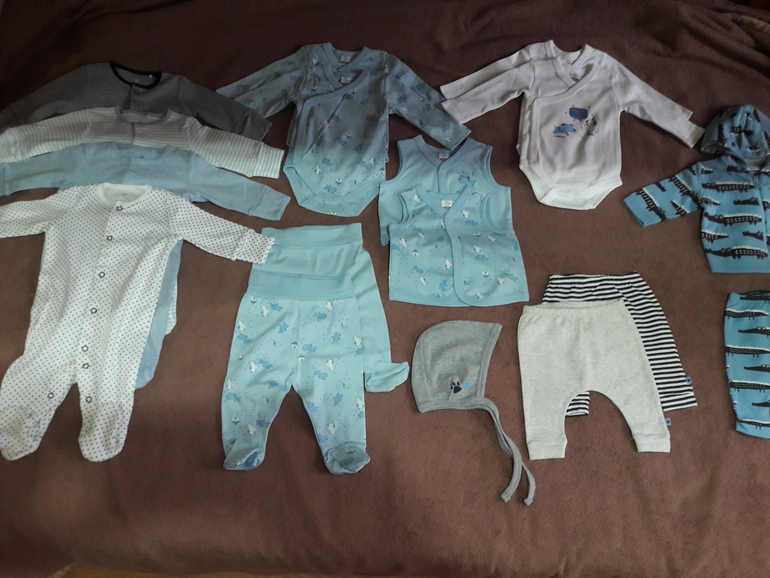 Например мне сказали мальчик и крупный, купила бело-голубое и размер одежды 0-3месяцев.