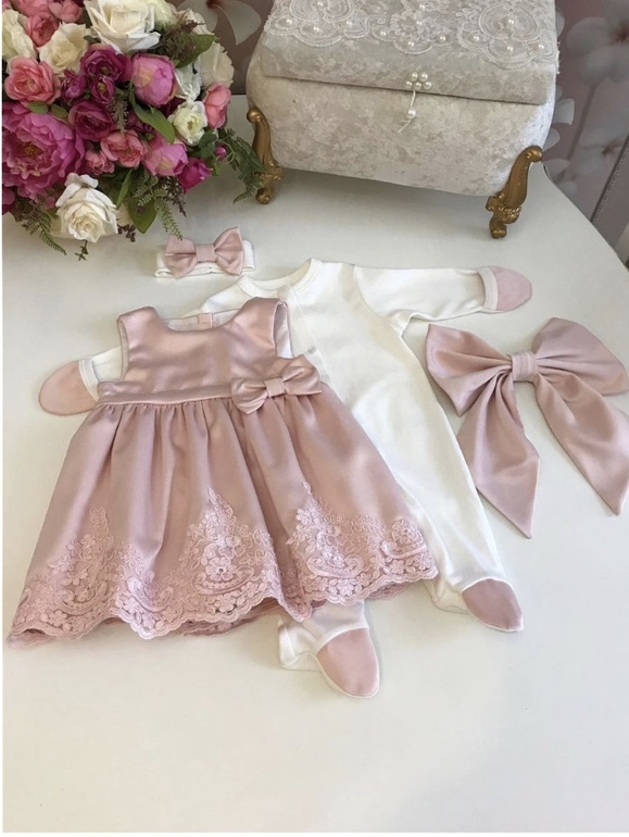 luxury Baby Комплект на выписку "Принцесса" Русский Сатин комбинезон и платье (розовое с розовым кружевом)