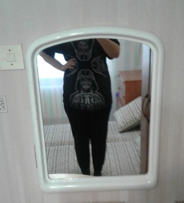 а вот так я хожу дома.Сын прозвал сестренку ДартомВейдером,за ним уже и дочь подхватила.Гладит меня по животу и приговаривает- "Дарт Вейдер нааааш")))Если другую футболку надеваю,огорчается- "А где ДартВейдер"Поросята,блин))