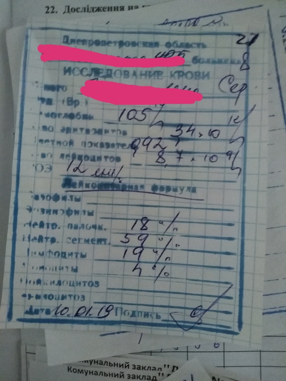 Анализы, скринингиПомогите пожалуйста разобраться,вчера была в больнице,капала Реосорбилакт,пришла кровь( не натощак) и моча( не самая первая) ,и моча по Ничипоренко,в общем моча вся в норме ,фото прилагается,а вот кровь ... С ноября принимая препараты железа не могу поднять гемоглобин выше 105,из-за этого цветной показатель низкий( это понятно) лейкоциты и соэ в норме,лейкоцитарная формула в норме,кроме палачкоядерных нейтрофилов,они повышены в три раза! 18% и только они и все... Посмотрела обмену,в конце ноября вообще 20! А я даже не знала об этом... Что это может быть,в понедельник опять в больницу,попрошу переслать + биохимию ,но все же,один этот показатель может говорить о бактериальной инфекции??