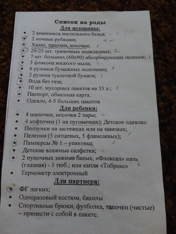 Это весь список. Из него берется часть в родзал, а остальное уже в палату. Само собой, есть ещё то, что вам и кроме этого может понадобится, да и можно вместо этого брать что-то другое, но плюс-минус на это надо ориентироваться. Особенно, что касается мыла, полотенец и т.д. К примеру, на вторые роды я уже брала кофточку-ползуны в родзал, но зная, что мне это неудобно, в палату уже брала в основном слипы. И на первые, и на вторые понадобилась своя посуда, чай, печенье. Воду лучше брать сразу детскую в 5-6 литровой баклажке, и одну-две бутылочки типа моршинской спортик, с нее удобно пить как на схватках, так и после родов сразу. Если ЕР, то тряпочные подкладные удобные, мне на схватках с вытекающими водами удобны были. Но дальше удобны урологические прокладки. И то, пол пачки было с головой, дальше обычные были. Лифчики для кормления, лактационные прокладки. Само собой, надо помнить о партнёре на родах и не помешало бы взять ему что-то перекусить. Ну, это то, что понадобилось мне и о чем так сразу вспомнила