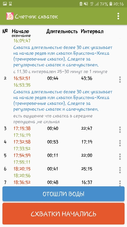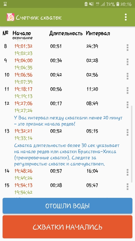 С 11.30 примерно с интервалом 30-25минут, потом 15-17, а теперь станные периоды пошли (от длинных до коротких). Очень смущает сумбур по времени в последних схватках. Терпеть и это треники, или уже готовиться выезжать. До роддома минут 15!
